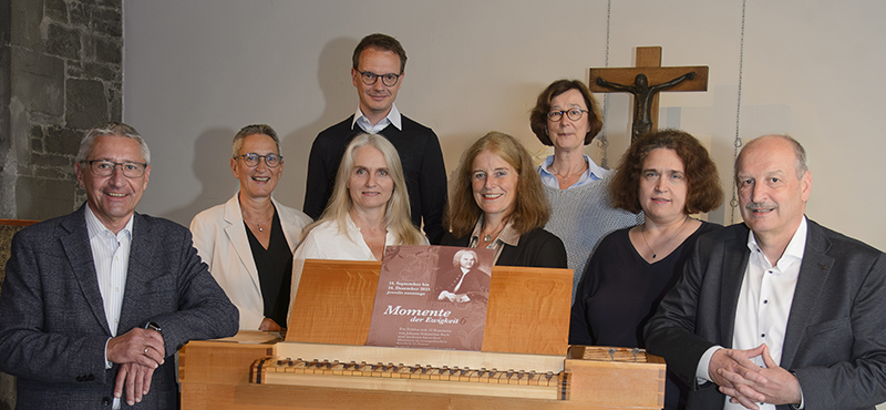 In der Essener Marktkirche präsentierten Kirchenmusikerinnen und Kirchenmusiker, Förderer, Superintendentin und Kreiskantor das diesjährige Programm der Reihe „Momente der Ewigkeit“ – v.li.n.re. Dirk Gersie (Geschäftsführer der Adolphi-Stiftung, Marion Greve (Superintendentin des Kirchenkreises Essen), Annette Wagner (Kirchengemeinde Kupferdreh), dahinter Andy von Oppenkowski (Kirchengemeinde Altstadt und Künstlerischer Leiter des Forums Kreuzeskirche), Imke Nörtemann (Kirchengemeinde Bergerhausen), Stefanie Westerteicher (Kirchengemeinde Altstadt, Auferstehungskirche), Ulrike Jerosch (Lutherkirchengemeinde Altendorf) und Kreiskantor Thomas Rudolph. Foto: Kirchenkreis Essen/Alexandra Roth.